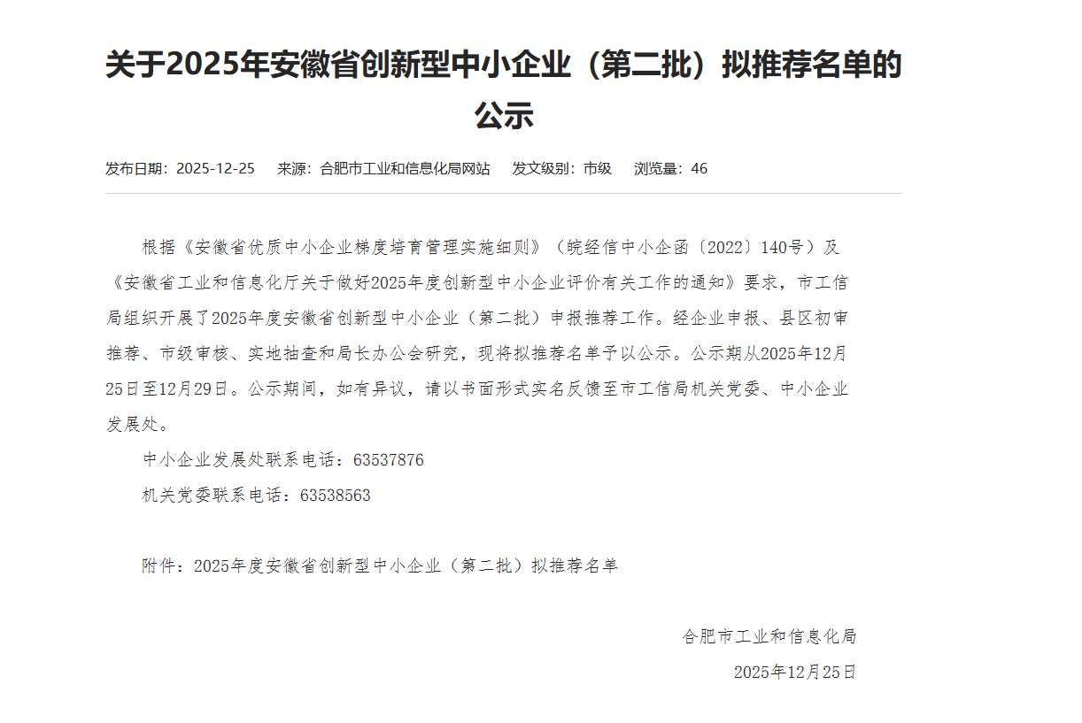 喜訊 | 祝賀我司榮獲2025年度安徽省“創(chuàng)新型中小企業(yè)”稱號